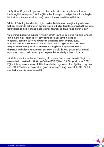 13. Eğitime 15 gün kala yapılan iptallerde ücret iadesi yapılmamaktadır.