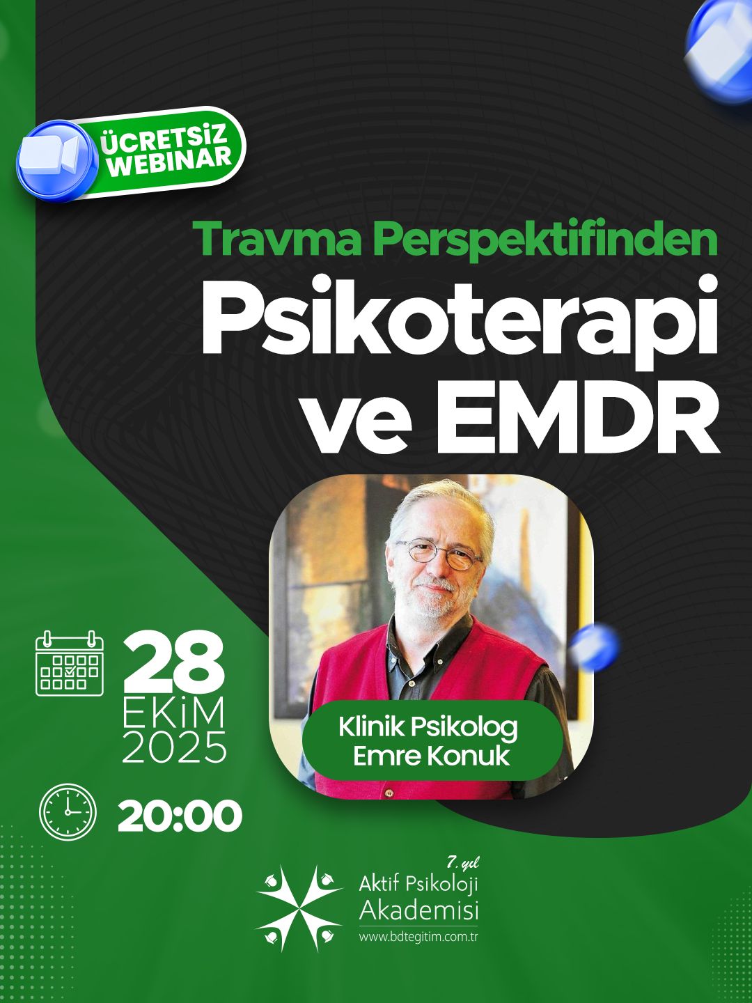 Bu webinar, travma temelli psikoterapi yaklaşımını bilimsel temelleriyle ele alarak EMDR’nin (Göz Hareketleriyle Duyarsızlaştırma ve Yeniden İşleme) terapötik etkisini derinlemesine incelemeyi amaçlar.